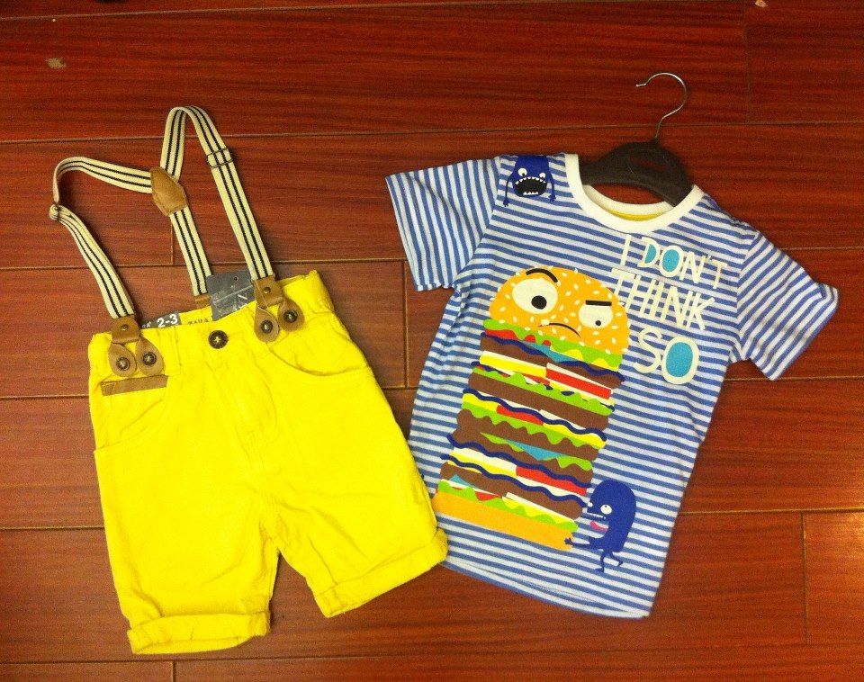 Thoi trang tre em theo xu hướng Color Block thì nên kết hợp màu vàng với màu xanh dương. Bộ trang phục này thích hợp với các bé hơi gầy một tí, các họa tiết sọc ngang sẽ làm cho bé trông có vẻ mập ra.